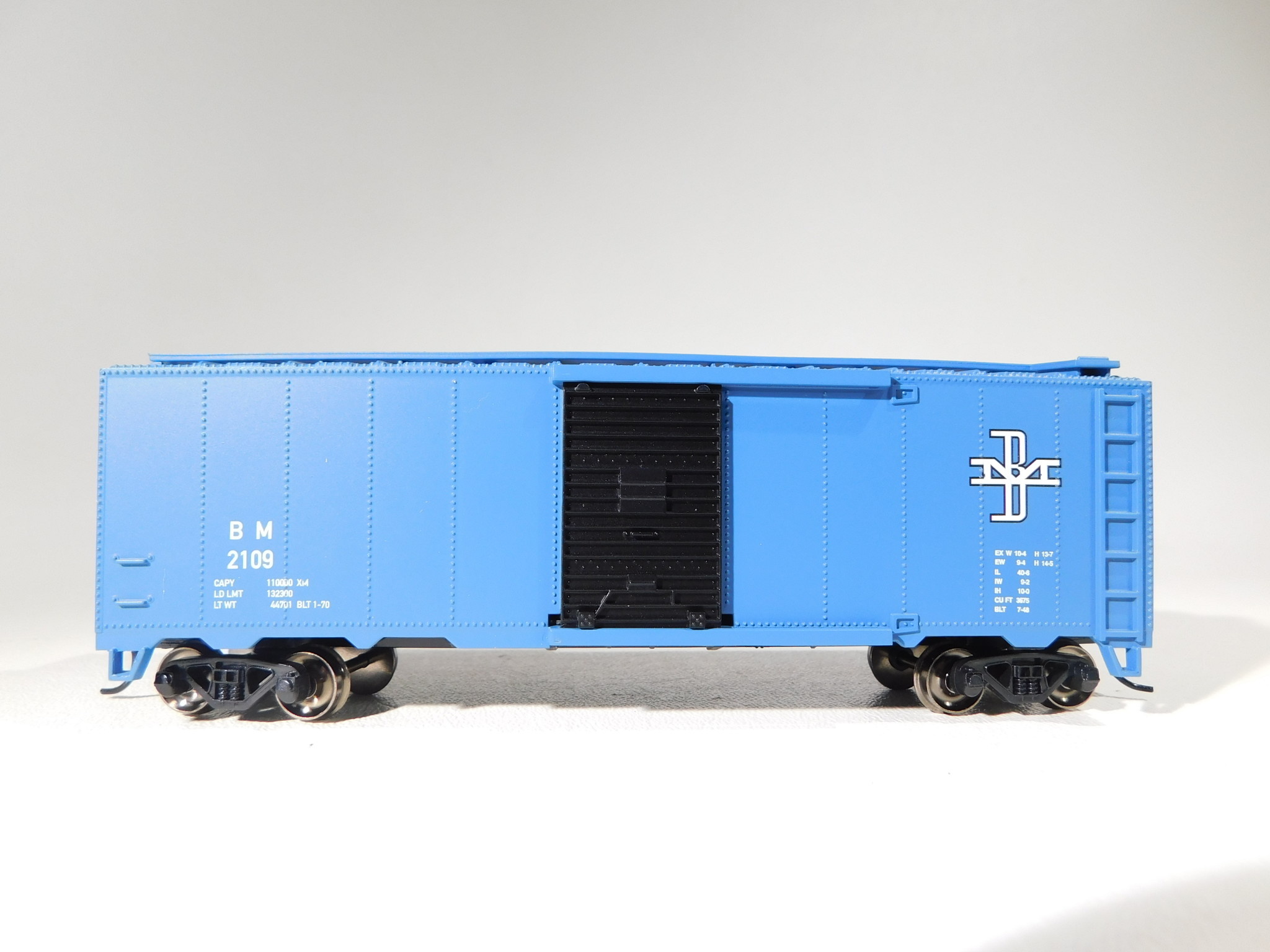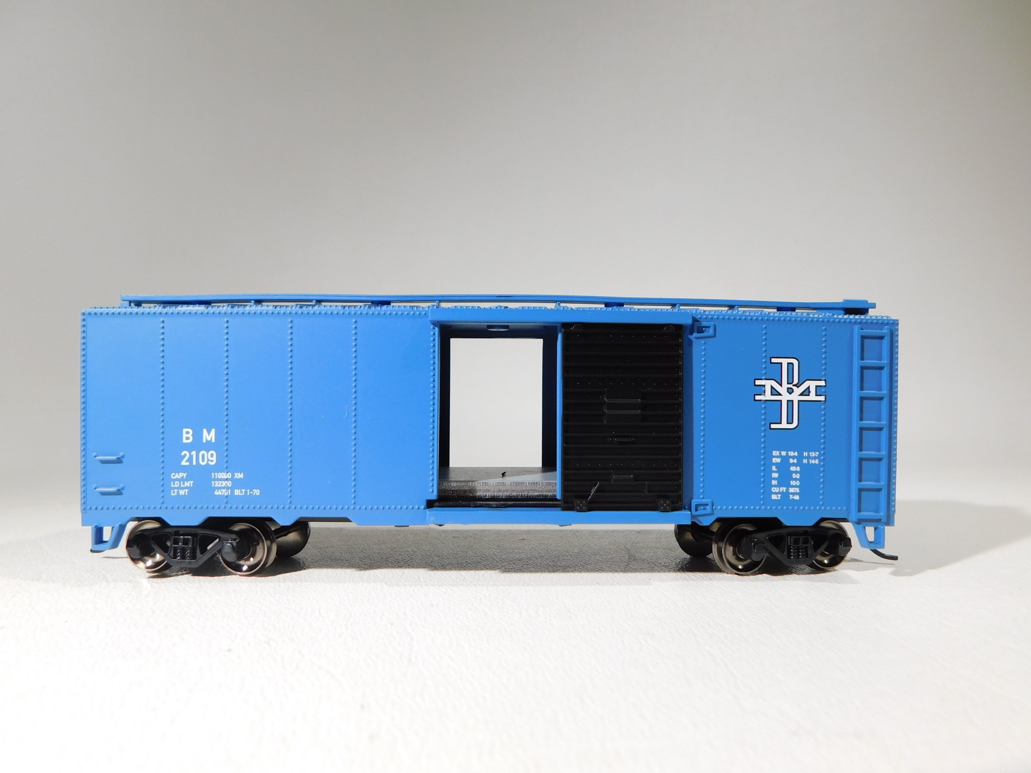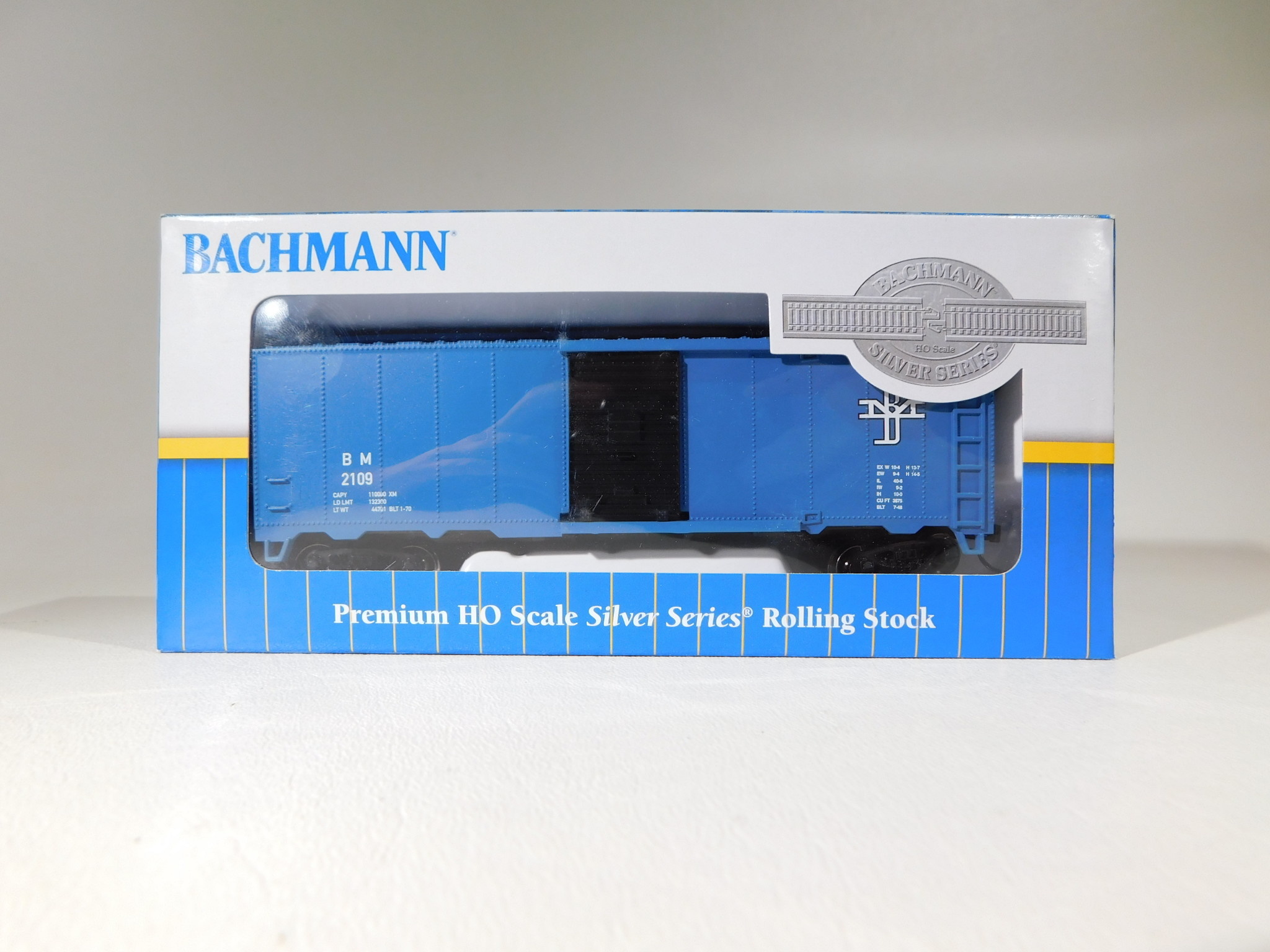 40' Box Car - BOSTON & MAINE #2109 - HO Scale. Box Cars are the workhorse on any railroad, as they are used to economically move merchandise across the country. Our 40 foot Box Cars come in a variety of road names, with prototypical paint schemes. Bachmann Silver Series® rolling stock features: Highly Detailed Painted Body with Precision Graphics, Sliding Doors, Blackened machined-metal wheels with RP25 contours, Magnetically operated body mounted E-Mate® couplers, Blackened-brass axles with needlepoint bearings, Celcon trucks, and has added weight for optimum tracking.