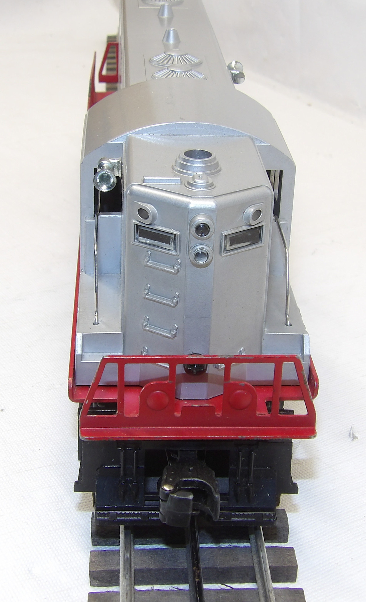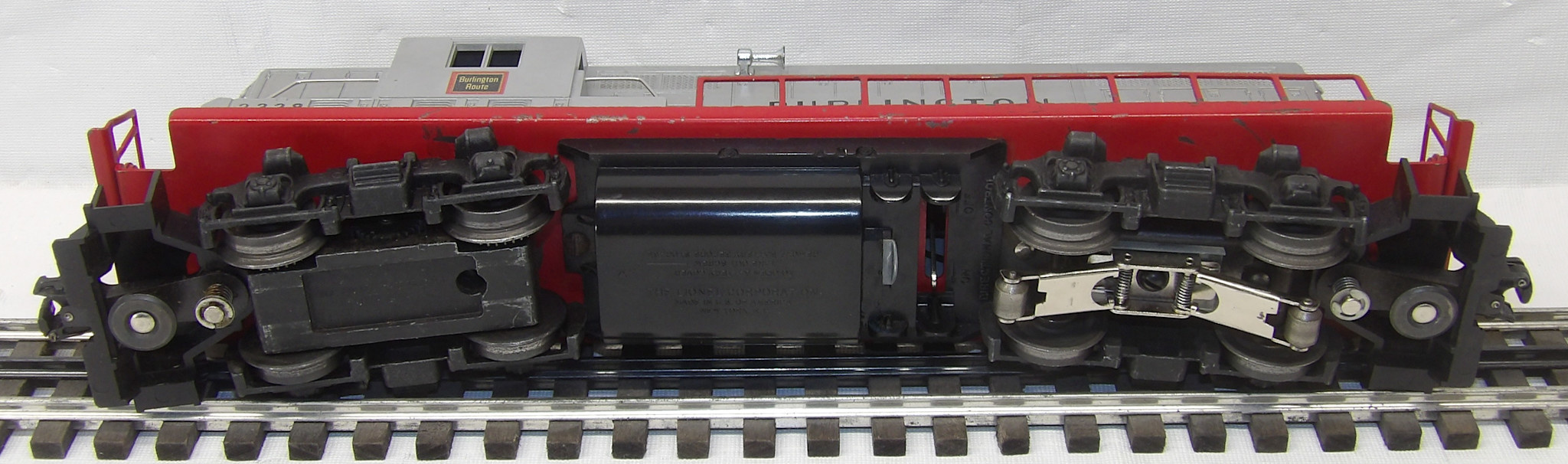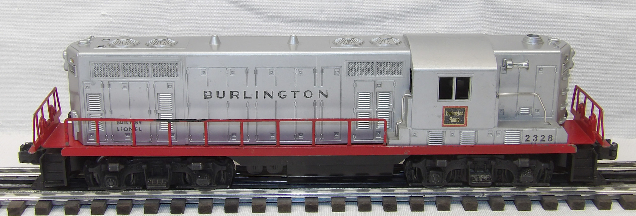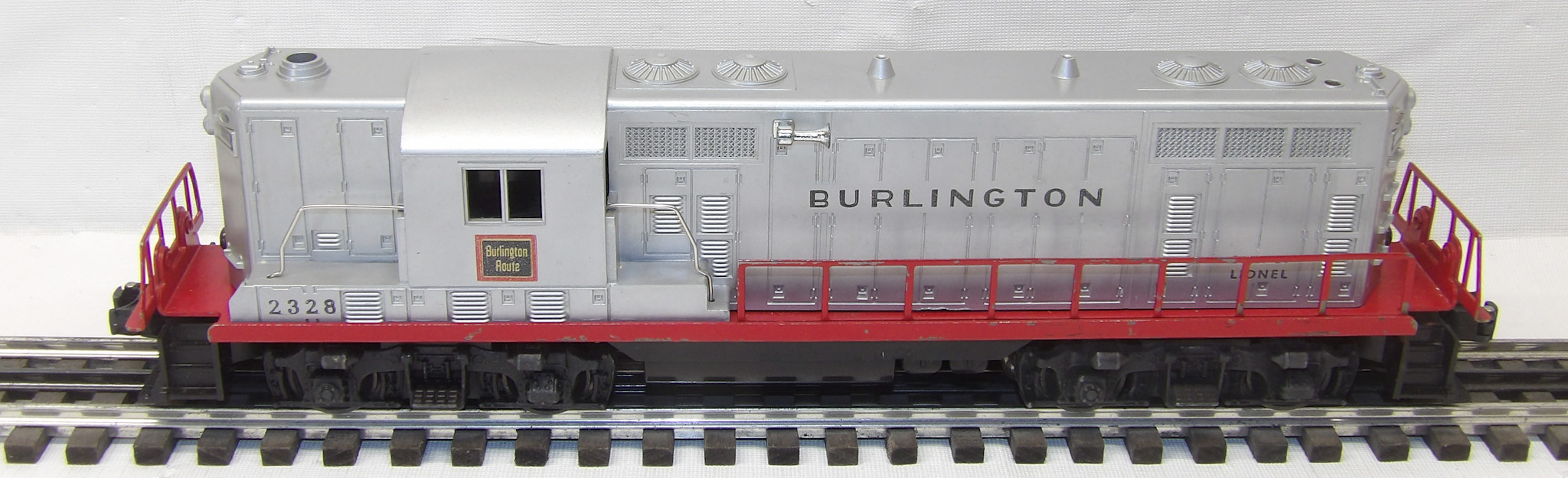 The Lionel Burlington GP-7 No. 2328 was available in 1955 and 1956. This engine came equipped with headlight lenses, number boards, horn, and the fuel tank that housed the D size battery for the horn, ornamental horns, and it was illuminated at both ends. The BLACK lettering was rubber-stamped on, as was the Burlington Route herald on the cab. Lionel issued this diesel with a RED sheet-metal frame, a three position directional unit whose control lever was adjustable from underneath the chassis, operating disc couplers, and a single vertical worm drive motor that powers two axles that used Magnetraction.