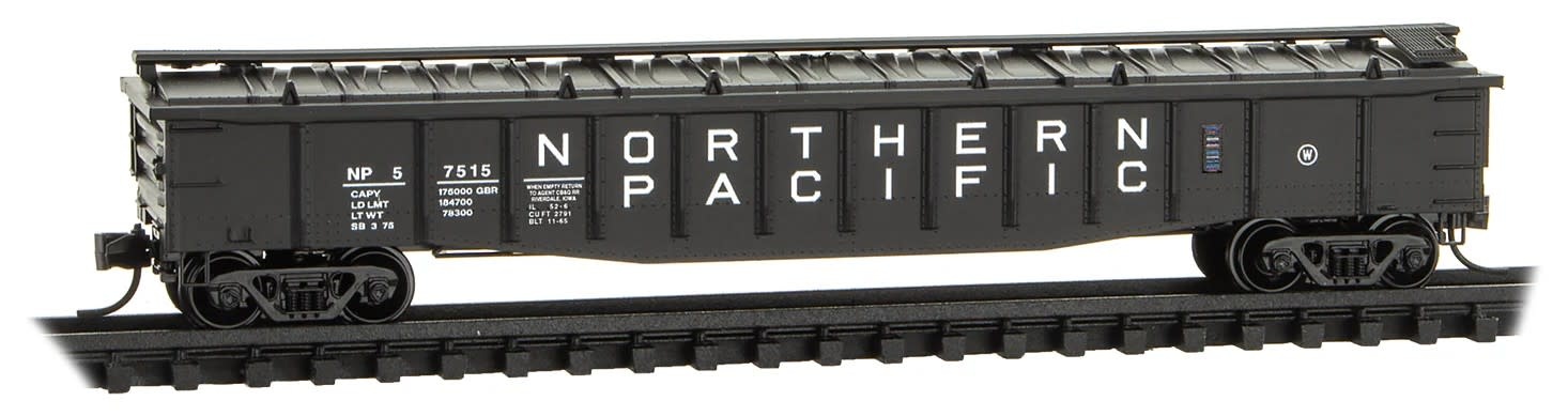 This 50’ steel dide, 14 panel, fixed end gondola with low cover is black with white lettering and runs on Barber Roller Bearing trucks. Built in 1965, gondola was among the first to have the new Northern Pacific block lettering scheme applied. When empty, the car was to be returned to the CB&Q Railroad in Riverdale, Iowa.