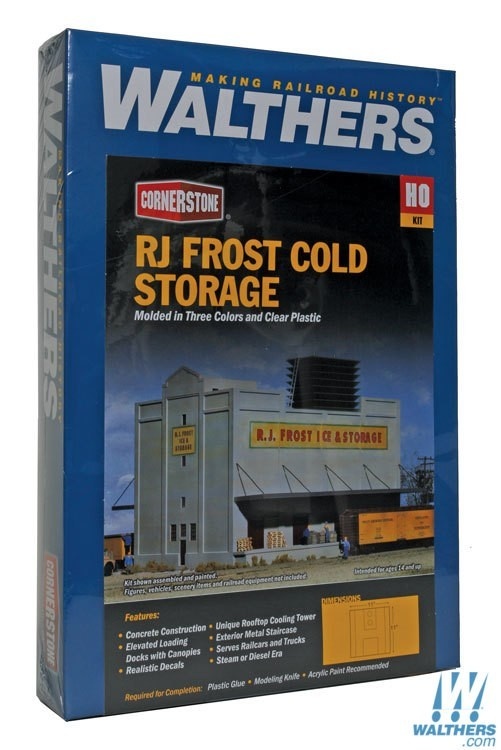 Next time you're in the grocery store, look at the incredible variety of fresh and frozen foods available. Most of them were grown and processed in another area, then shipped to facilities like the prototypes of Walthers Cornerstone RJ Frost Ice and Storage. Along they way, they spent some of their rail and truck journey in a cold storage plant. These buildings are commonly found in agricultural areas where foods are readied for shipment, and in large cities where the food is stored for pickup by local customers. This kit captures the look and feel of a large cold storage warehouse in a size that fits most layouts. The kit includes concrete walls, truck and railcar docks with canopies and a large rooftop cooling tower. It'll look great along your railroad's industrial trackage or in small towns where multiple packing houses process perishables for shipment. As shown RJ Frost Ice and Storage measures: 11 x 11" 28 x 28cm.